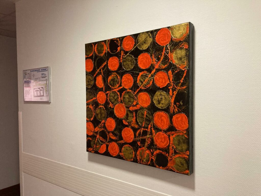 Elle a accroché différentes séries de toiles, nées d’approches techniques et de tailles variées, toutes libres à la vente à l’issue de l’événement. C’est ainsi que ses « Absorptions murales » sont conçues et exécutées pour que les couleurs vives du mur qui accueillera le tableau viennent faire partie de l’oeuvre, en les « absorbant », pour ne plus faire qu’un avec cette toile, la mariant ainsi au lieu où elle se trouve momentanément.