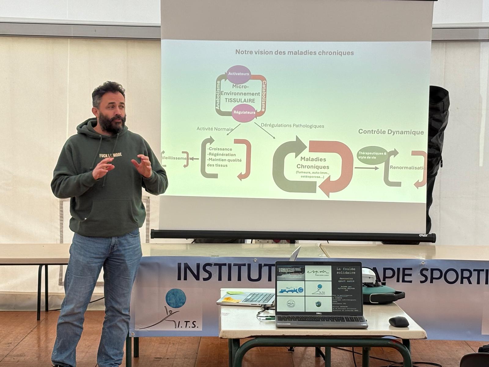 Nous avons poursuivi ces actions d’information et de sensibilisation le week-end. Samedi après-midi, nous avons participé à un échanges autour du thème « sport et santé » organisé par l’ITS avec le témoignage de patients (anciens et actuels). Il y a eu aussi l’intervention d’un chercheur de l’IAB, membre de notre conseil scientifique, qui a expliqué la liaison entre la cellule et l’activité sportive… et a terminé en mettant l’accent sur la stratégie 80/20.